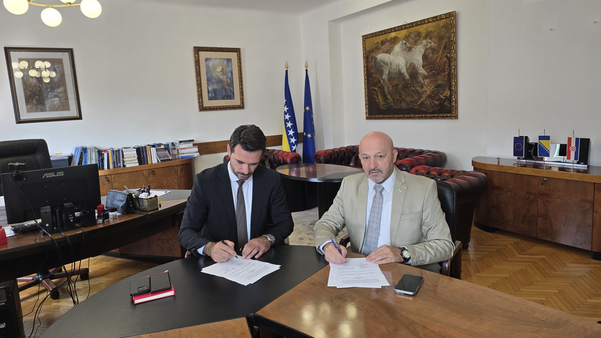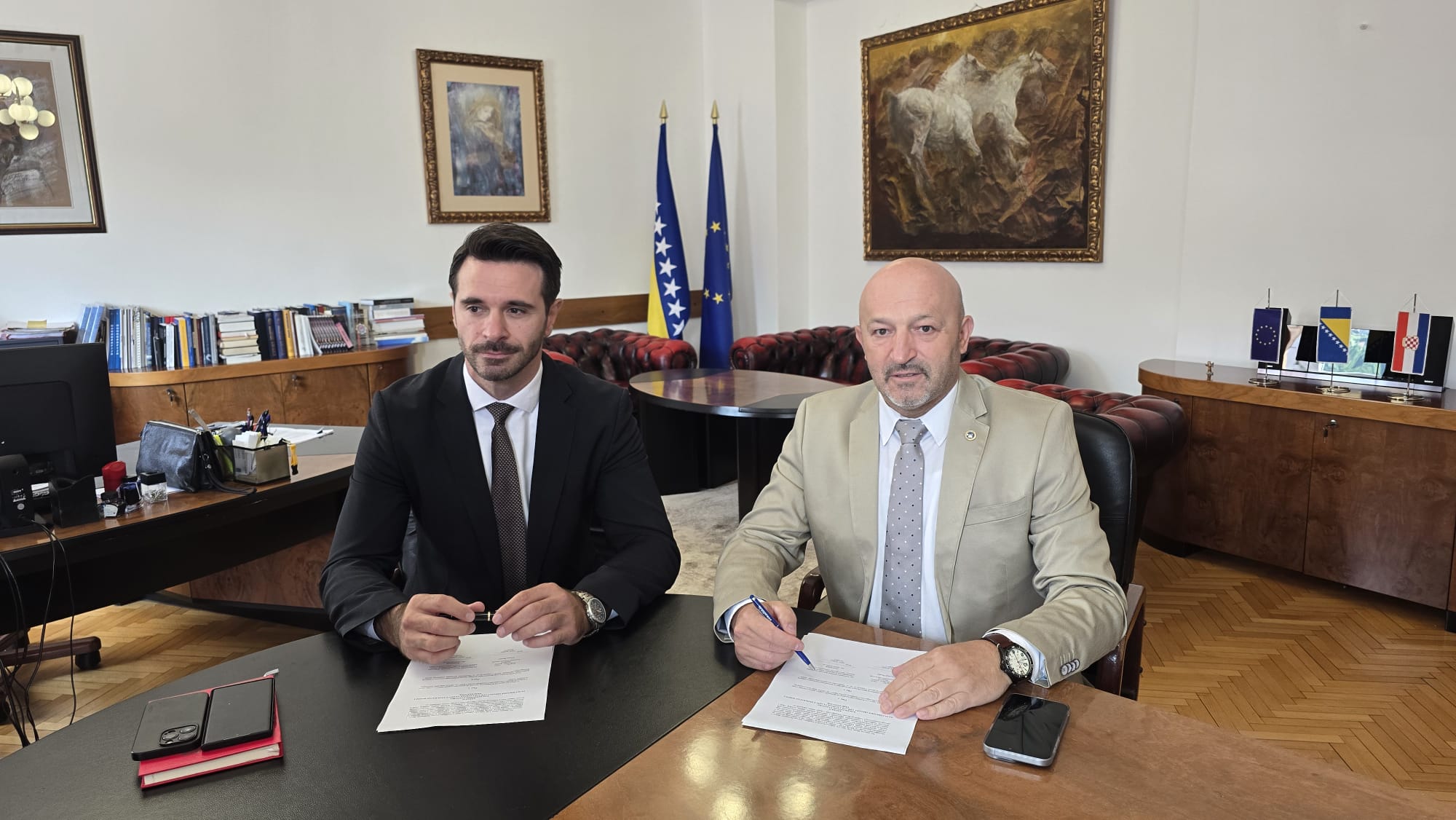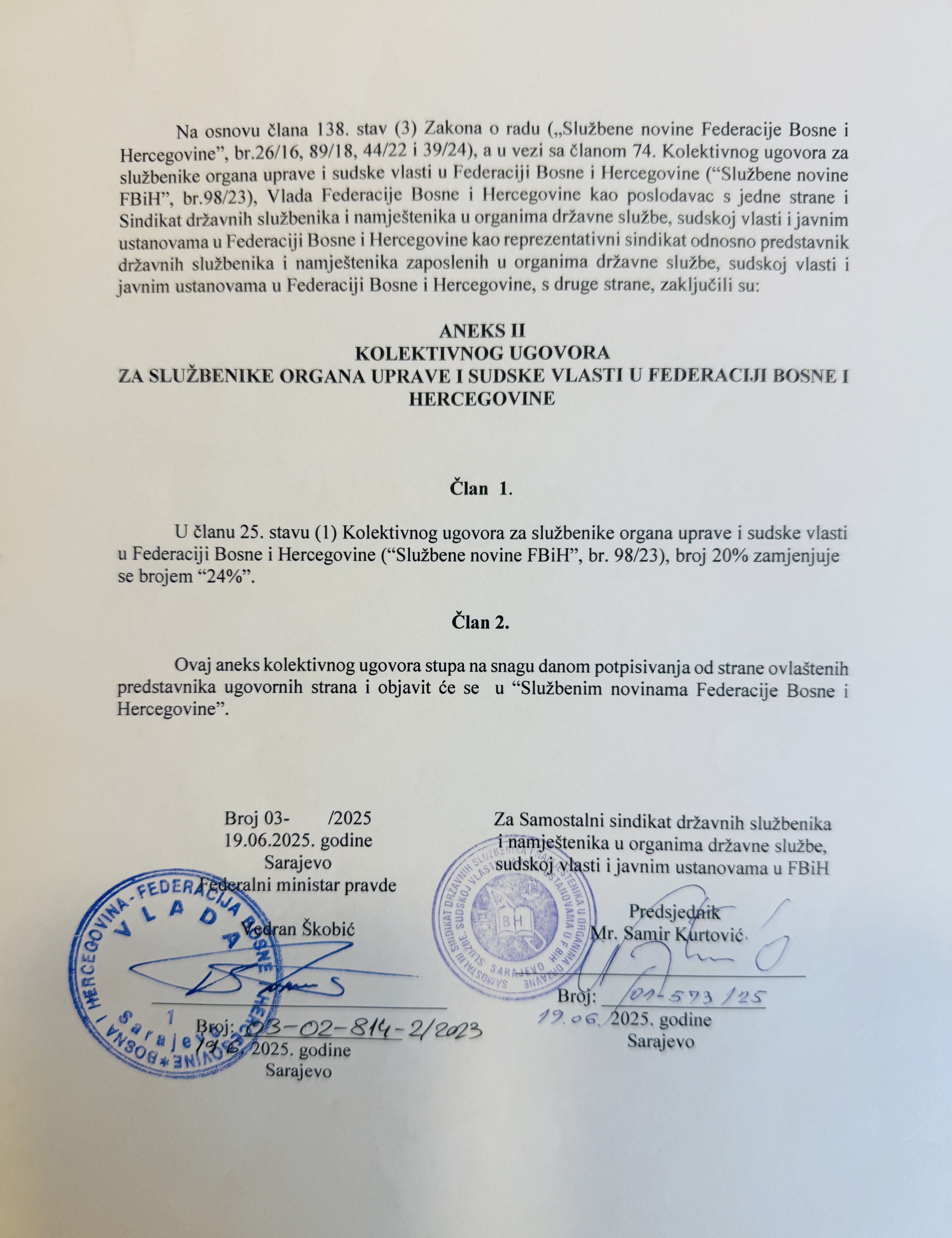 Obavještavamo članove Sindikata i cjelokupnu javnost da su dana 19.06.2025. godine, uz prethodno pribavljenju saglasnost Vlade Federacije Bosne i Hercegovine (“Službene novine Federacije Bosne i Hercegovine”, broj 42/25 od 09.06.2025. godine), u prostorijama Federalnog ministarstva pravde, Samir Kurtović, predsjednik Samostalnog Sindikata državnih službenika i namještenika u organima državne službe, sudskoj vlasti i javnim ustanovama u Federaciji BiH u ime Sindikata i Federalni ministar pravde Vedran Škobić u ime Vlade Federacije Bosne i  Hercegovine, potpisali Aneks II Kolektivnog ugovora za službenike organa uprave i sudske vlasti u Federaciji Bosne i Hercegovine.